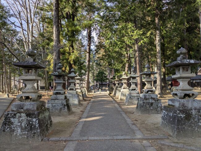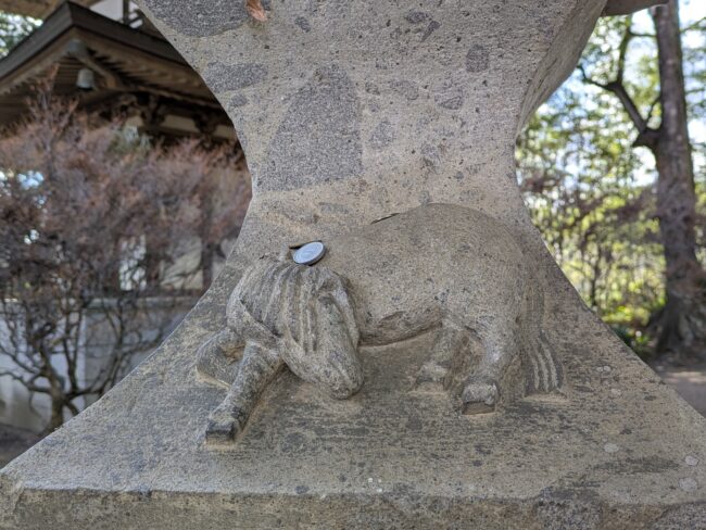 夢窓疎石らの三像が安置された開山堂と三重塔の間に、武田不動をまつる明王殿へ向かう参道がありますが、両脇の石灯籠には十二支の文様が施されています。